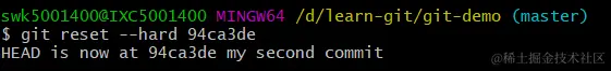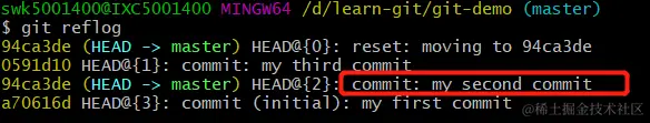 我现在要回到第二次提交的版本,复制出版本号,使用如下命令: