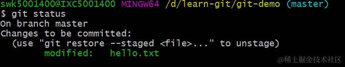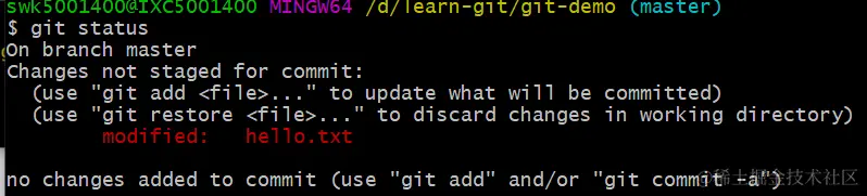 上面是新增一个文件,但是最多的场景还是同一个文件被反复修改,现在我去修改hello.txt文件,增加写内容,然后git status。