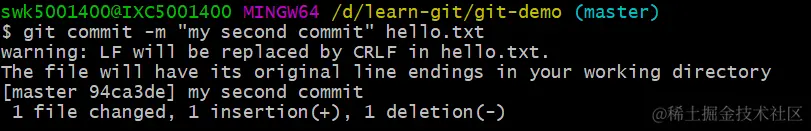 这里看到最后的提示,有一行新增,一行删除,可是我只是在第一行后面继续增加了内容。