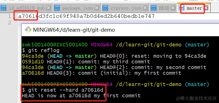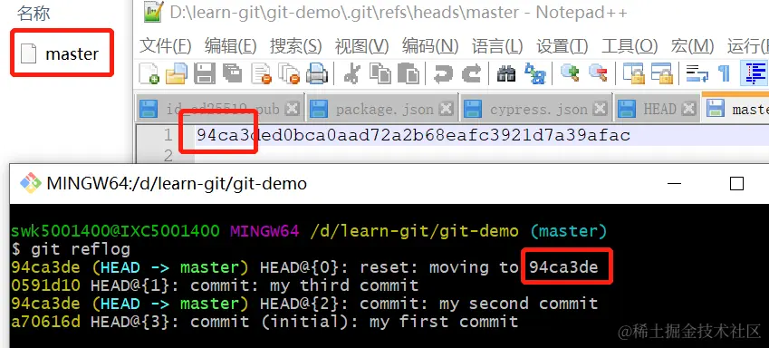 接着,可以打开.git/refs/heads/下面的master,可以看到里面的内容就是当前所在版本的版本号。