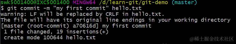 出现一个warning,说的是换行符自动替换处理,因为那个文件我直接在git-bash窗口用linux命令新建的,所以自动转化了win用的CRLF,不用管它。