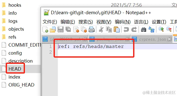 可以先打开本地的.git下的HEAD,可以看到里面指针指向master,说明当前是在master分支上。