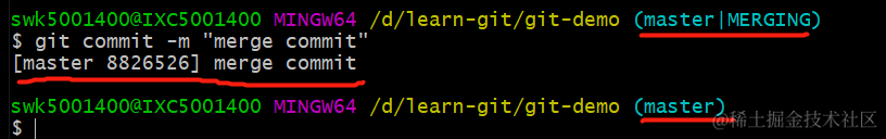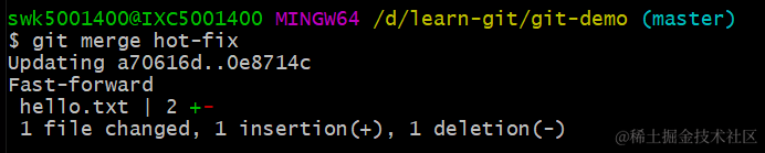 注意,这里是把命令行后输入的分支 合并到 当前所在分支,所以我先要切回到master上,才可以把hot-fix合过来。