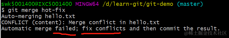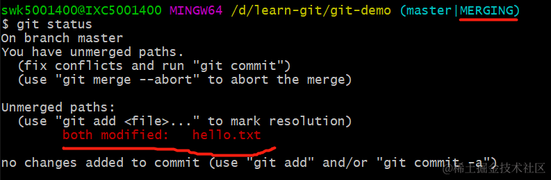 提示自动合并失败,因为在hello.txt里面产生了冲突,此时查看git status,也可以看到提示。