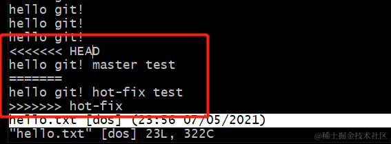 OK,git处理不了,只能我们亲自出马了。此时可以打开文件vim hello.txt,会发现在文件里有冲突的提示。