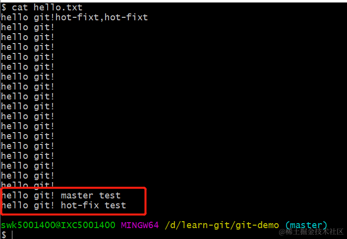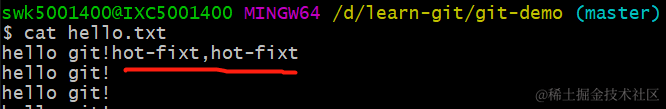 注意,这里合并时候的修改,也只是改了master分支的文件内容,hot-fix分支是不受影响的,可以切到hot-fix查看文件内容便知。