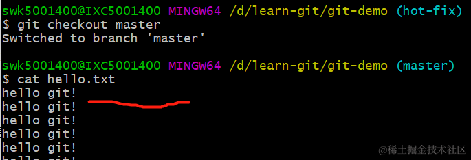 在hot-fix修改完内容提交之后,现在切换回master分支,并且查看文件内容,发现还是原来的样子,没有受到影响。