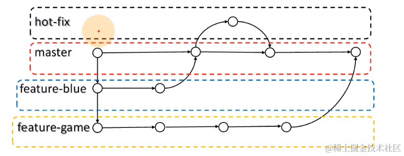 - 发现feature-blue上有个bug,那么再从master上建一个热修复分支hot-fix进行bug修改,完事后合到master。