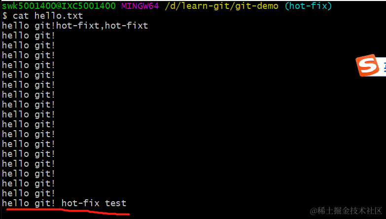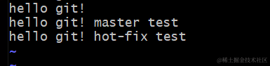 hot-fix分支,在hello.txt的最后一行末尾,增加新内容-"hot-fix test"。 - 切换到