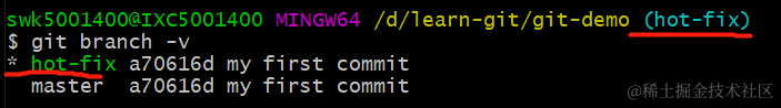 当前所在还是master分支,我不想动master分支的内容,希望在hot-fix分支上进行修改,那么现在切换到目标分支。