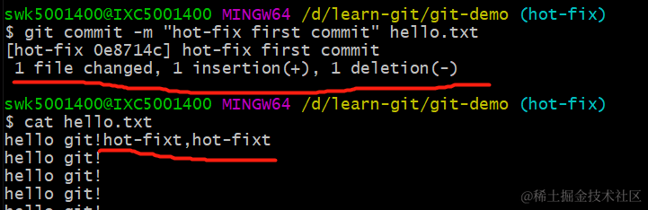 然后git add hello.txt和git commit -m "hot-fix first commit" hello.txt 。