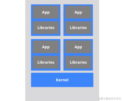 在容器内的应用进程是直接运行于宿主机的内核,容器内没有自己的内核,更没有进行硬件的虚拟。容器就不再使用一个公共的lib库了,每个容器都有一个自己的lib,