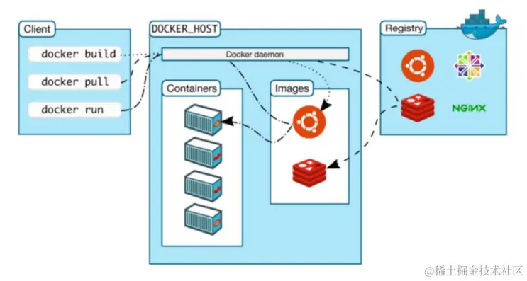 - DOCKER_HOST:就是docker服务。容器运行就是在这里面,docker daemon是守护进程,通过Images镜像运行一个个容器Containers。关于Images可以想象成代码中的类,