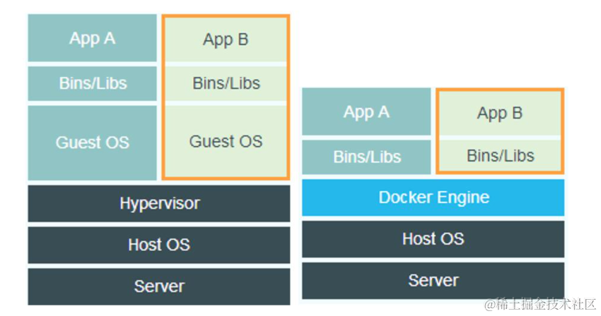 - docker利用宿主机的内核,vm则是利用Guest OS,也就是你安装到虚拟机的系统。