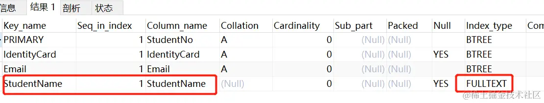 可以查看student表的所有索引SHOW INDEX FROM student;