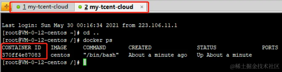 可以看到启动容器成功,为了方便,我多开一个窗口。