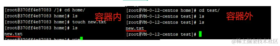 接着,我在容器内的/home下新建个文件new.txt,然后查看主机下的/home目录,发现文件已经同步。