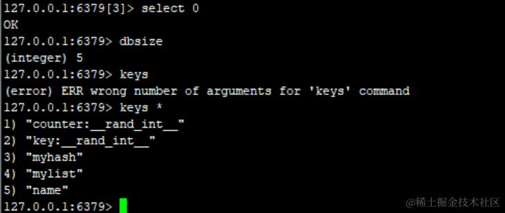 可以查看所有的key。这里切换回默认的数据库,查看所有key。