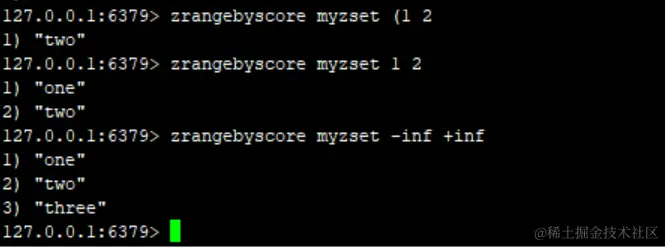 zrangebyscore myzset (1 2 # 这里相当于 1< score <=2