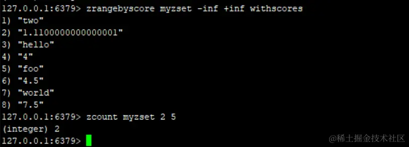 zrangebyscore myzset -inf +inf # 这里-inf +inf 相当于 负无穷、正无穷,显示出所有