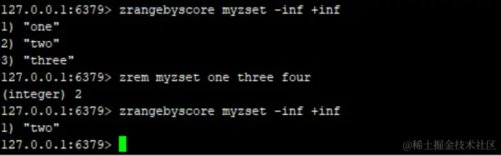 zrangebyscore myzset 1 2 # 这里相当于 1<= score <=2