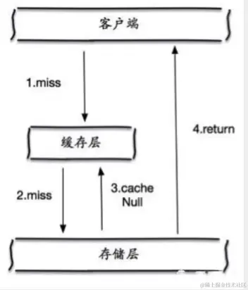 用户想要查询一个数据,发现redis内存数据库中没有,也就是说没有命中缓存,也是会向持久层数据库查询,发现也没有,那么本次查询失败。