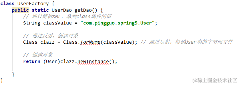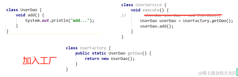 通过 UserFactory 这个工厂类,降低 UserService 和 UserDao 这2个类的耦合。