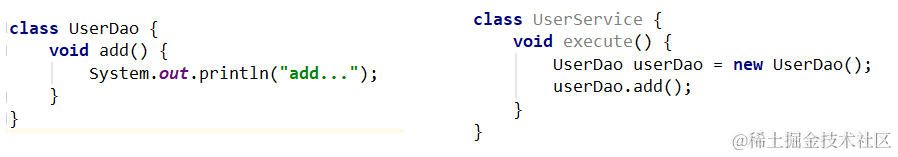 用图示表示下,初始的对象调用的样子。比如我在 UserService 类中想调用 UserDao 类下的 add() 方法,需要 new 一个 UserDao 的对象。