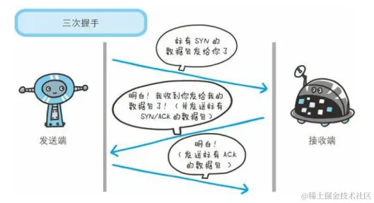 - 第三次:最后,发送端再回传一个带有 ACK 标志的数据包,代表“握手”结束。
