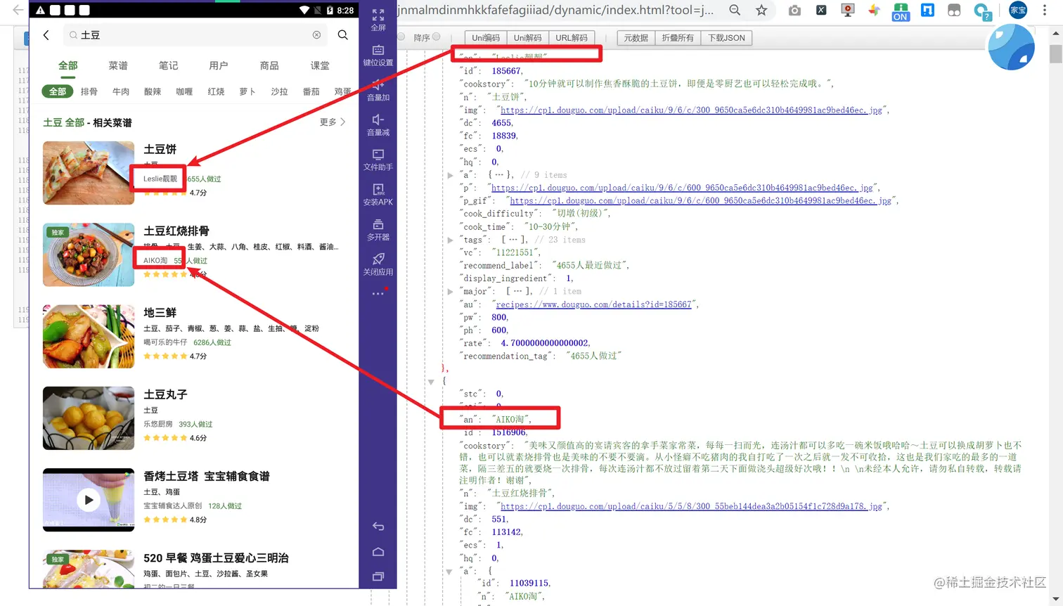 核对一下结果,结果有 results 字段,每一个条目的 an 字段就是该菜谱作者的信息,这与 App 里面呈现的内容是完全一致的,如图所示。