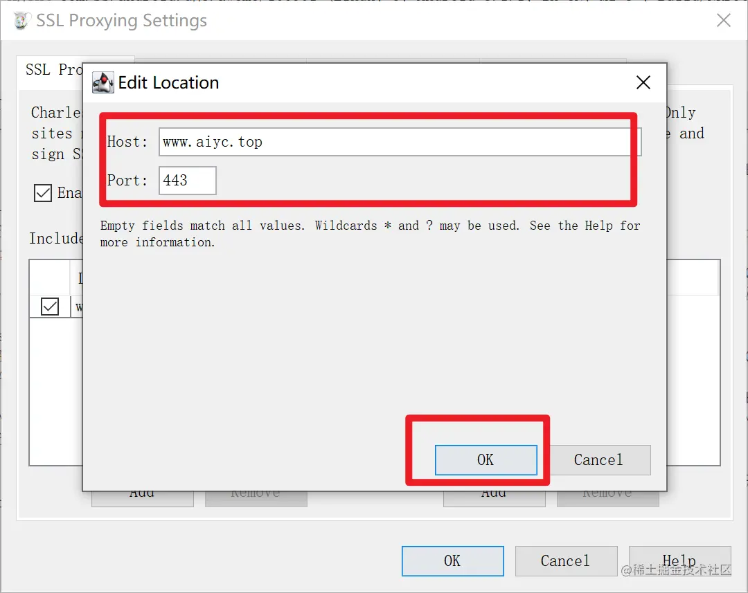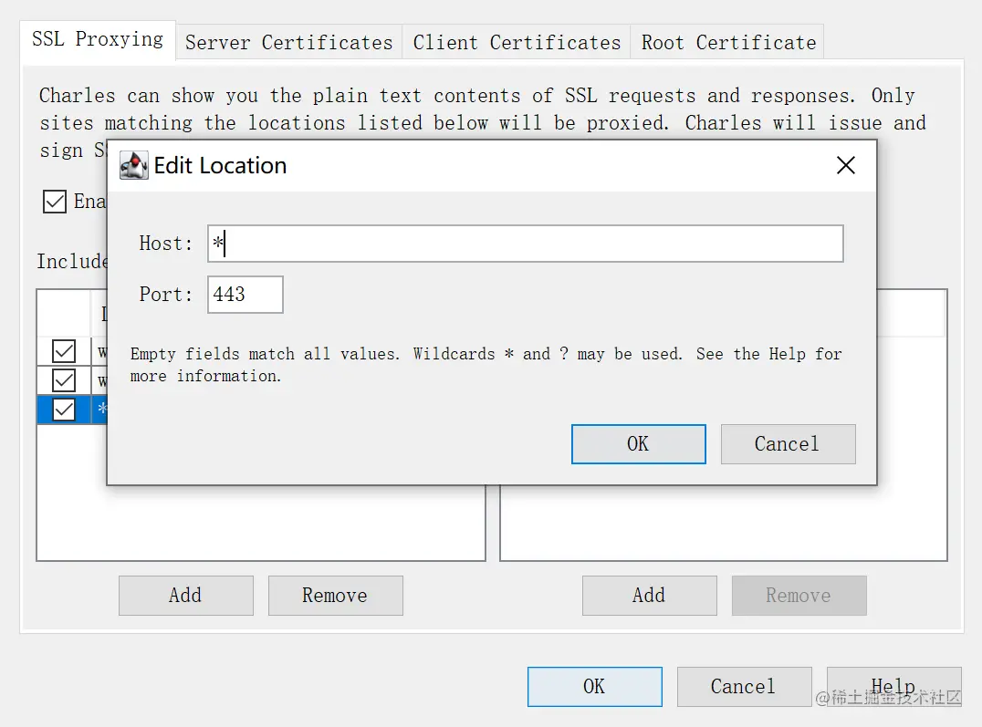 Proxy –> SSL Proxying Setting –> Enable SSL Proxying 点击 Add,编辑 Location,输入 Host: * , Port: 443,点击 OK。(当然,你也可以指定 HTTPS 主机)