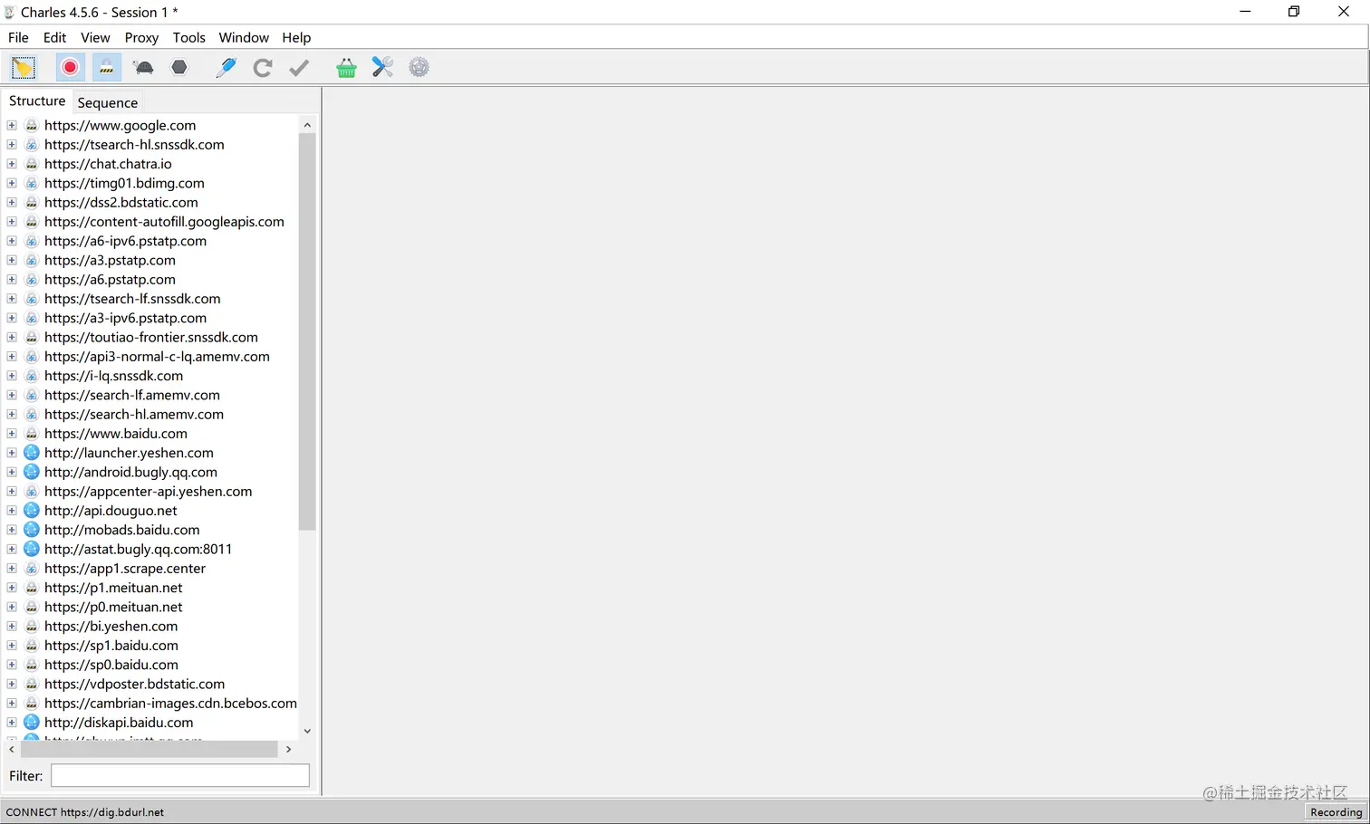 好,我们先打开 Charles,初始状态下 Charles 的运行界面如图所示。