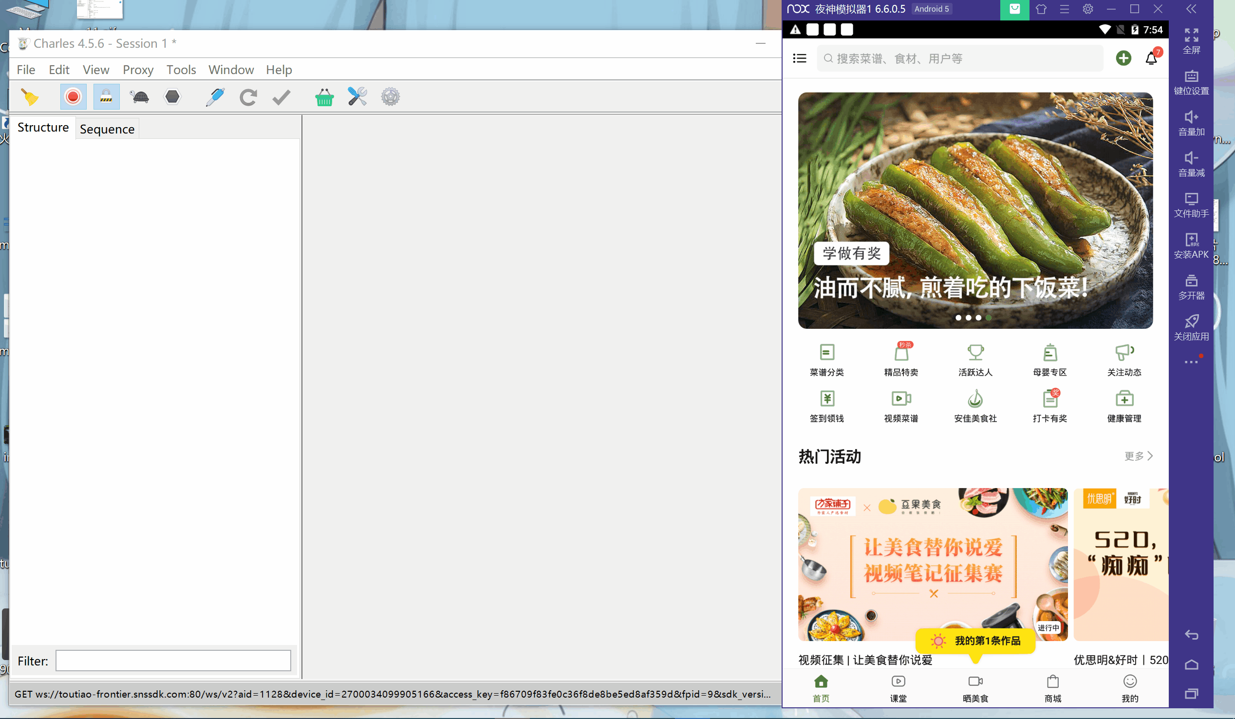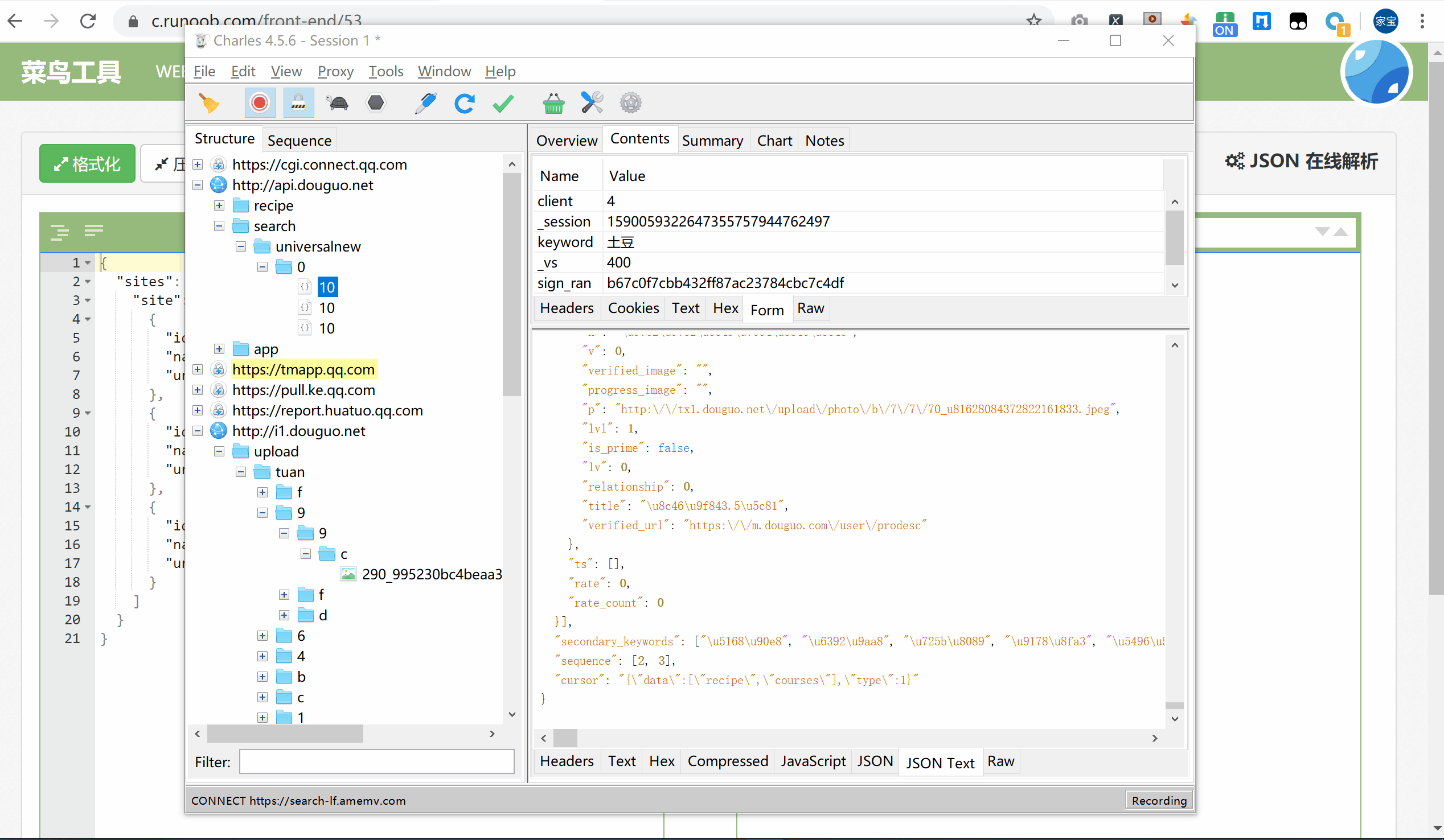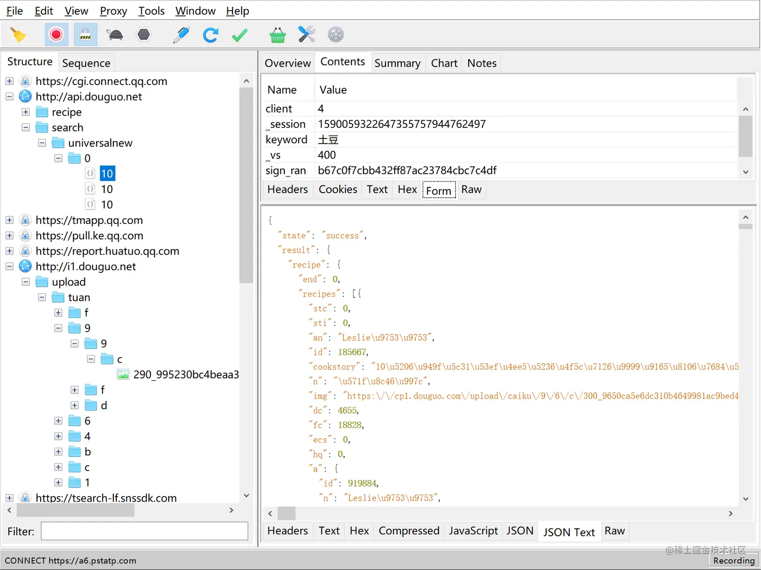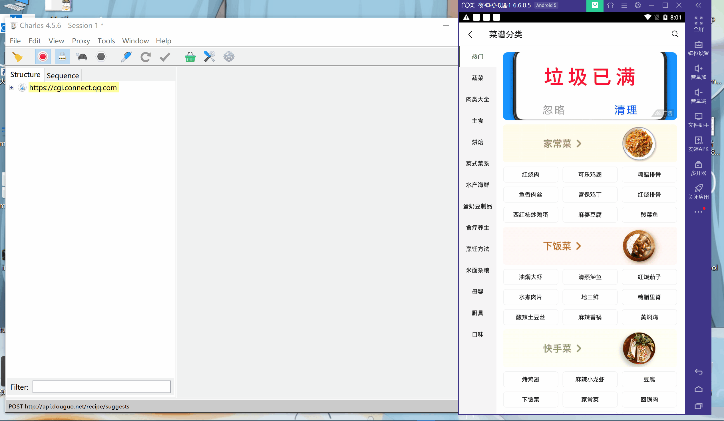 这时候我们先清空原本的抓取数据,也就是点击那个“扫把”就可以清空。然后 APP 里面我们点击“菜谱”分类。就可以发现 Charles 里面已经抓取到了对应的数据包,出现了类似如下动图所示的结果。