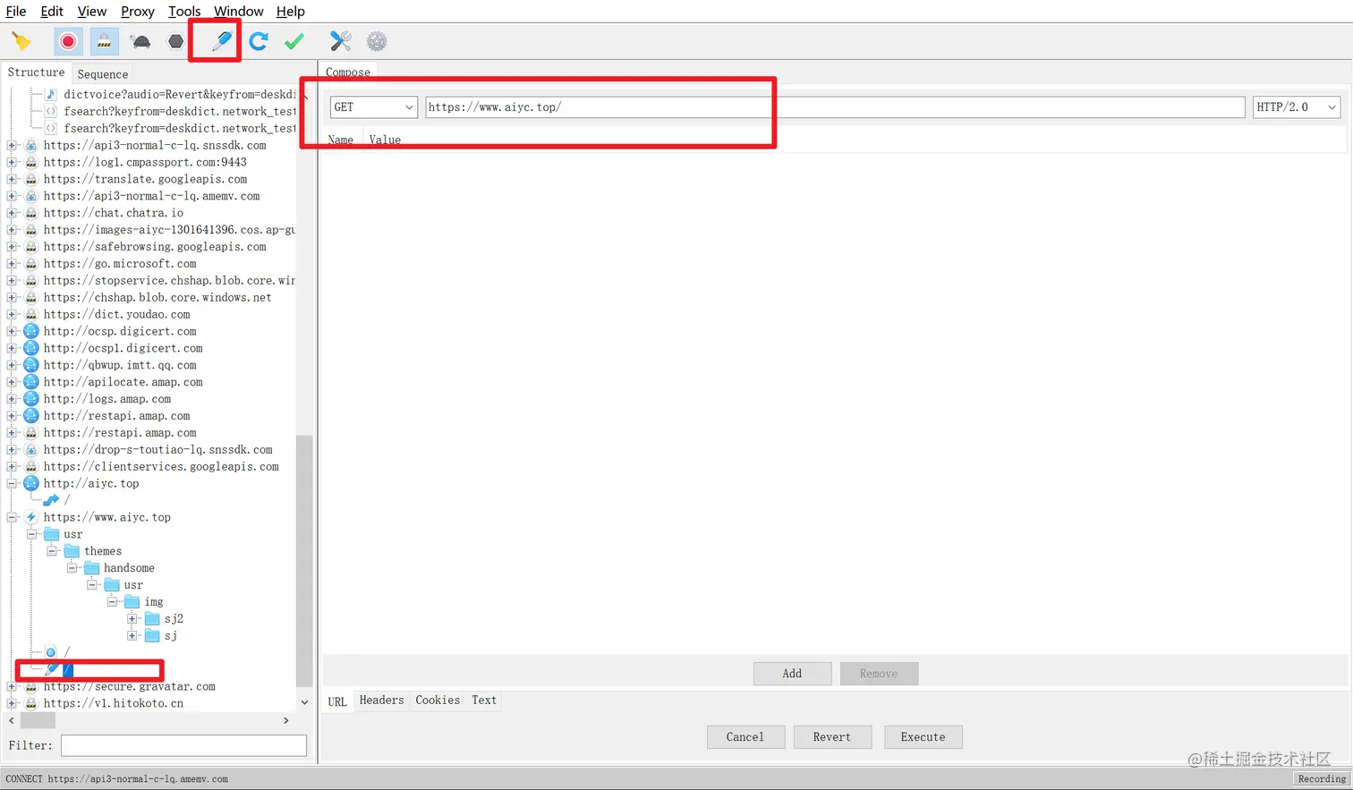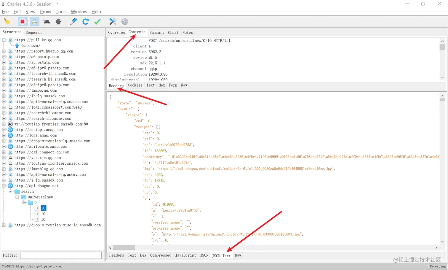 左侧列表中会出现一个 api.douguo.net 的链接,而且在 App 上拉过程它在不停闪动,这就是当前 App 发出的获取数据的请求被 Charles 捕获到了。