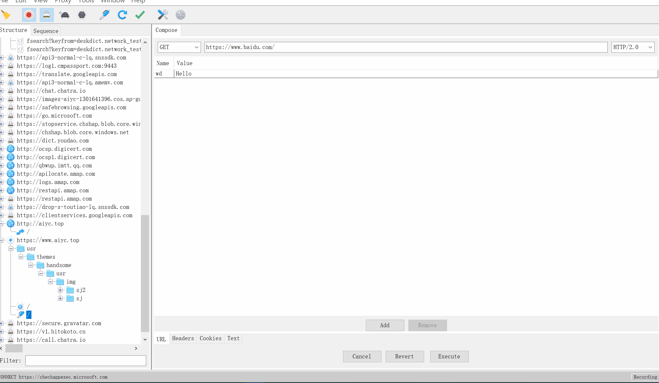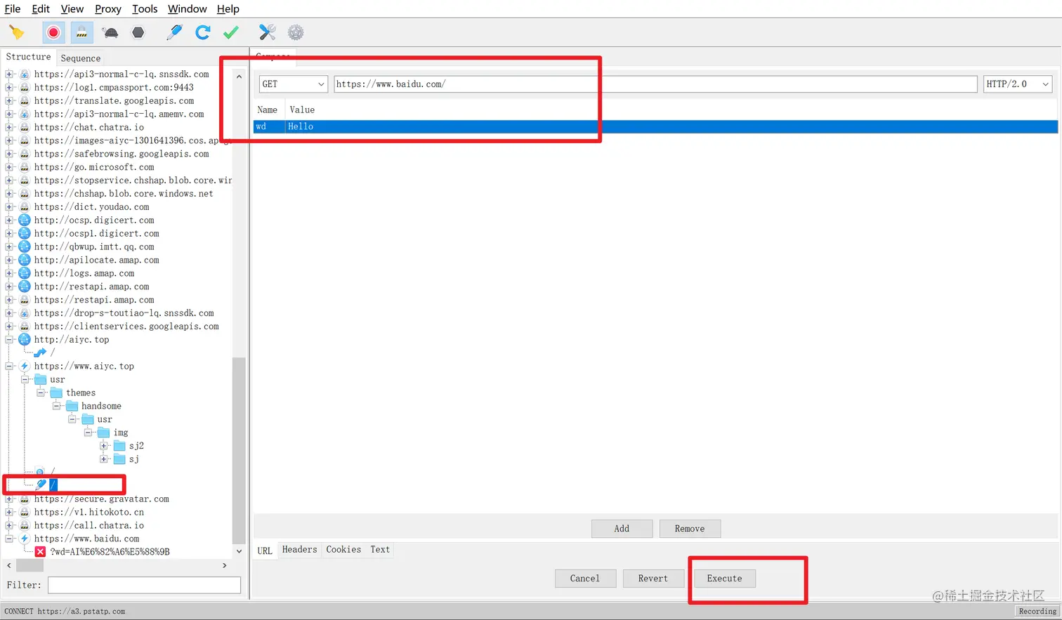 我们可以修改原本的请求链接,修改成访问百度,然后携带的参数添加:wd、Hello 然后点击下方的 Execute 按钮即可执行修改后的请求,如图所示。