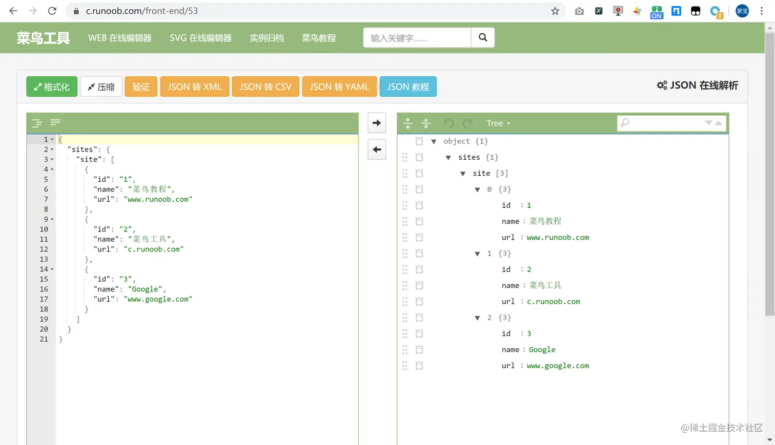 我们可以发现编码显示不正常是个 Unicode 编码,这里我们使用 Json 格式化一下,操作如下,先访问该链接:c.runoob.com/front-end/5…,界面如下: