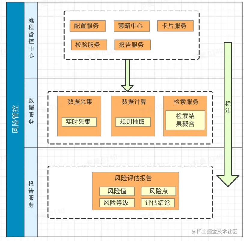 - 上层策略⼤盘:提供过程指标和基准值,通过绑定的各类卡⽚发现并暴露存在的⻛险点