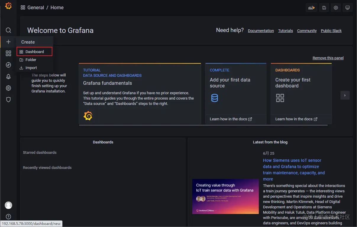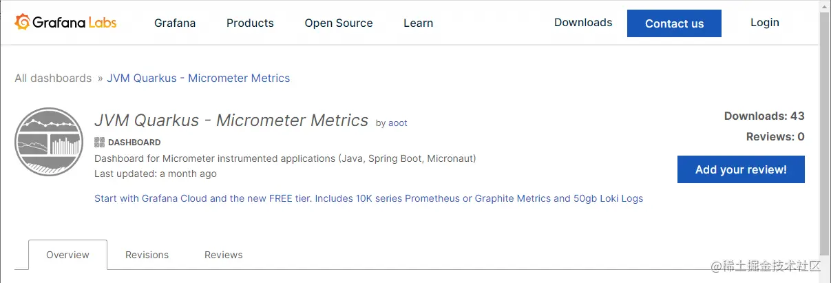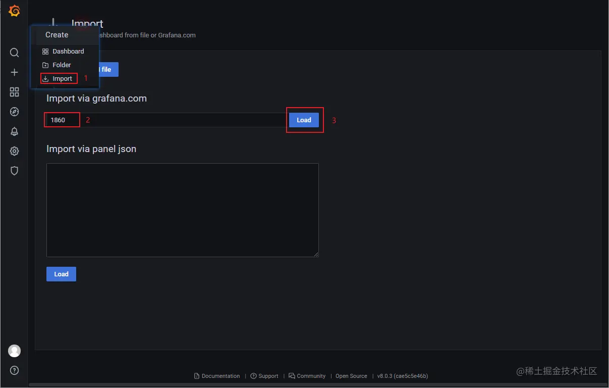 - 当然你还可以选择去Grafana的仪表盘市场下载一个Dashboard,市场地址:grafana.com/grafana/das…