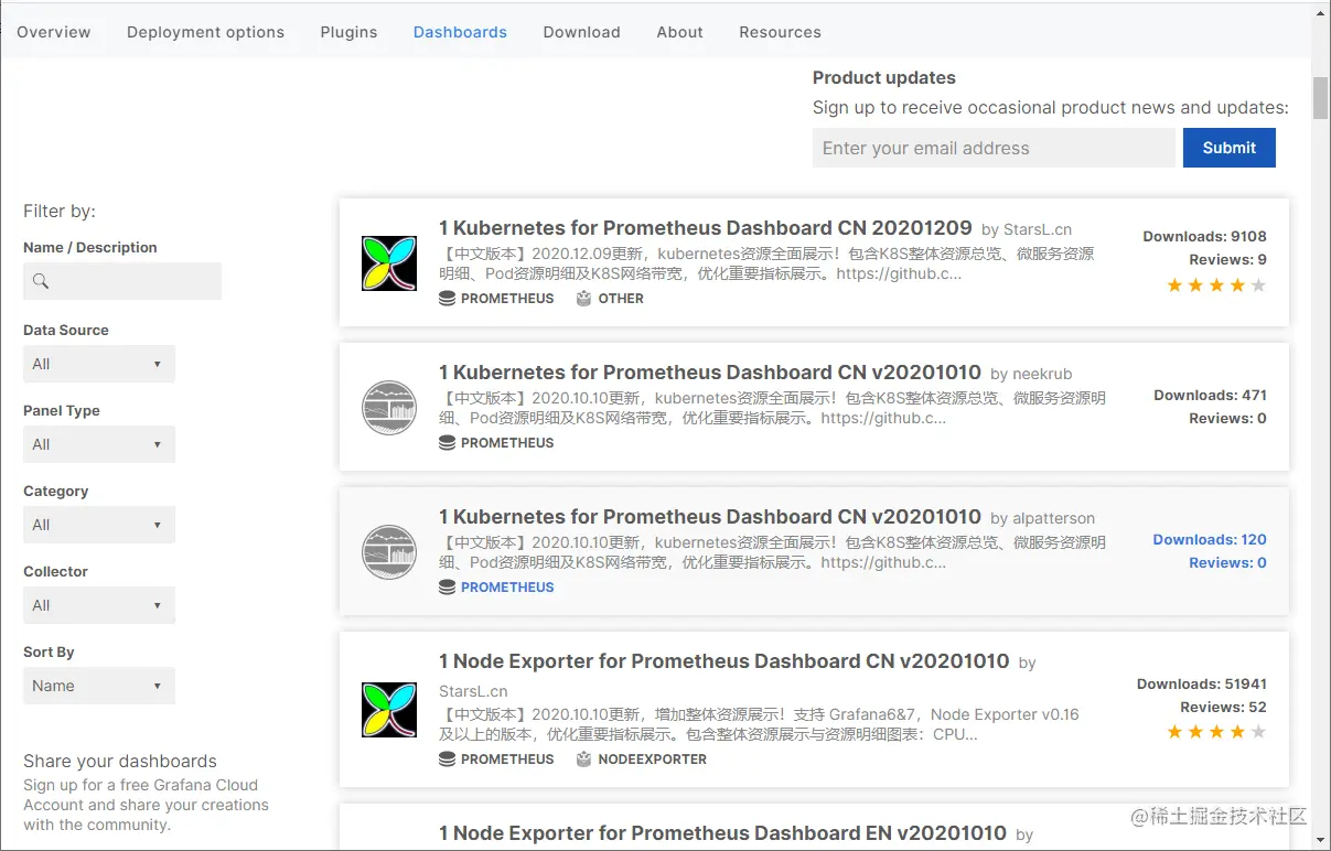 - 同样,我们可以从仪表盘市场导入仪表盘,访问地址:grafana.com/grafana/das…