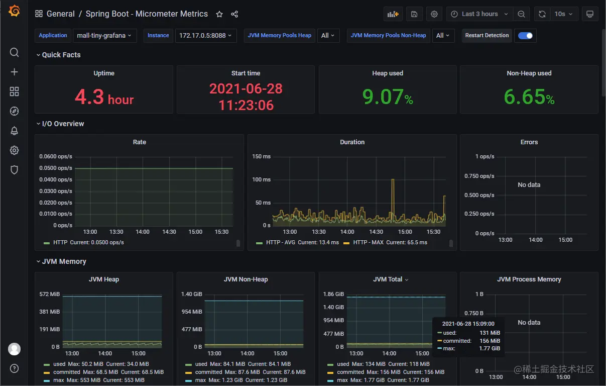 - 导入成功后就可以在Grafana中看到SpringBoot实时监控信息了,果然够炫酷!