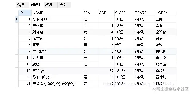 VALUES ('20', '陈哈哈😓', '男', '20', '181班', '9年级', '看片儿');