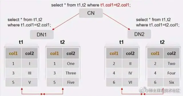 - 原理:CN 通过优化器把原语句中的部分语句生成 RemoteQuery 计划,把每个 RemoteQuery 下发到 DN,DN 执行后把中间结果数据发送给 CN,CN 收集后进行剩余执行计划的执行计算,CN 承担了大部分计算。