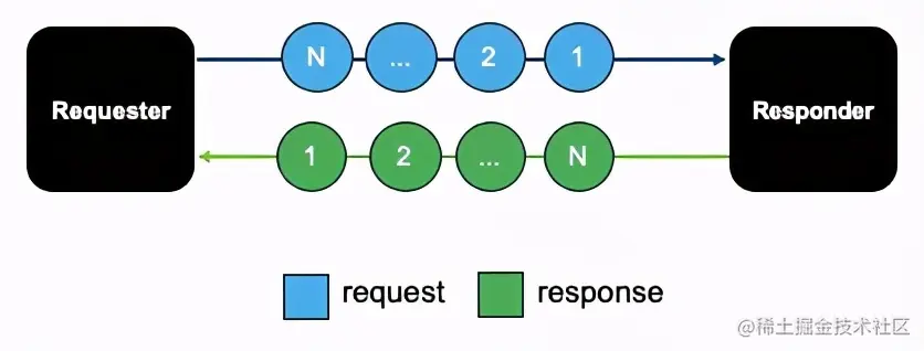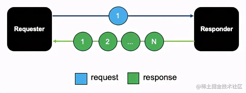 请求方发送一个请求报文,响应方发回N个响应报文。传统的MQ是典型的RequestStream。