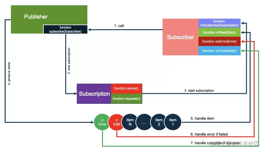 - 中途可以调用subscription随时cancel取消订阅,或者通过request(n)通知生产下N个元素,这个过程即背压。