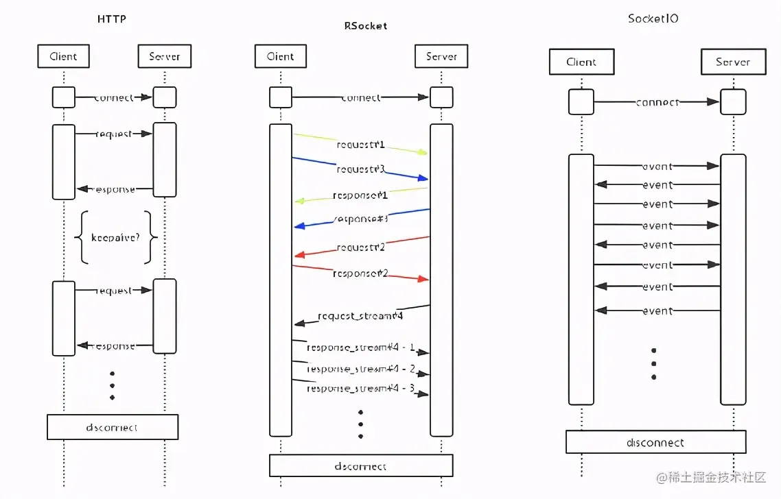综上与HTTP做一些比较,RSocket的效率更高,支持的通讯场景更丰富,也没有队头阻塞的问题。与SocketIO这种基于纯事件的框架相比,RSocket的请求具有很清晰的上下文,API精炼易用。
