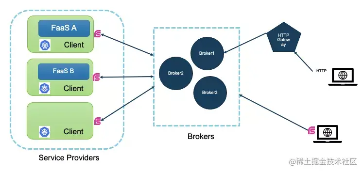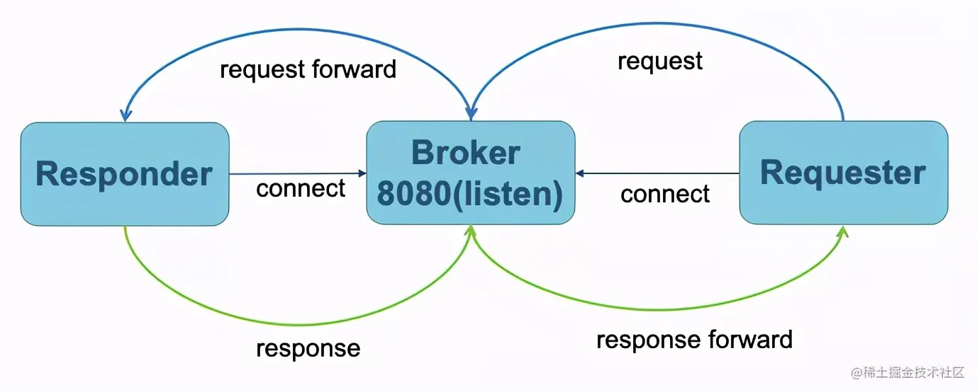 另外最经典的玩法就是Broker了,Broker类似一种“软路由”的方案,可以让服务的发布访问变得简单。发布服务只要连接到Broker,调用方通过反向请求的方式来让Broker透明转发即可,摒弃了传统的注册中心,端口管理等常见的服务治理手段。