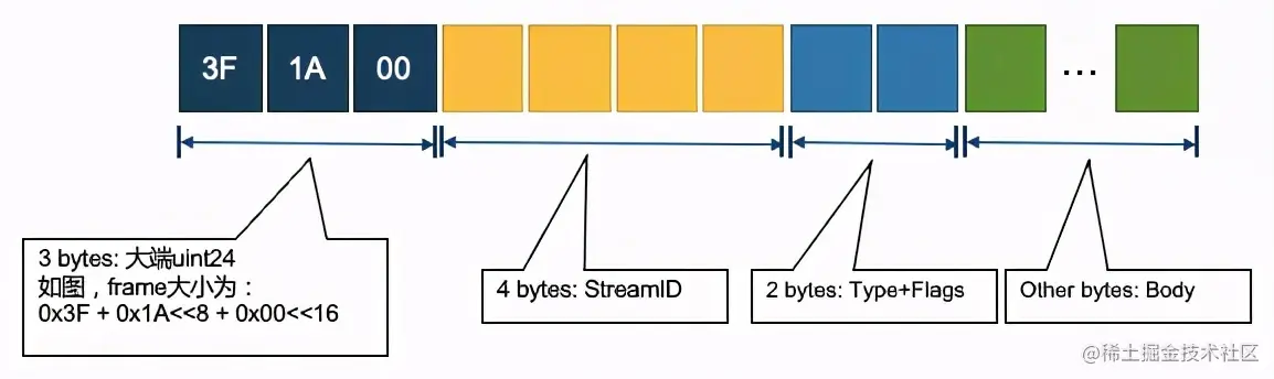 - 一个帧由6 bytes的Header和剩余的Body构成,其中Header的4 bytes表示 StreamID,6 bits表示Frame Type, 10 bits作为Flags。Body根据不同的帧类型,结构也不同,常用的带Payload的帧一般会包括Metadata和Data两个部分。