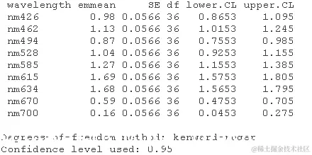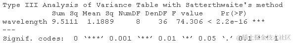 - 各个波长之间的差异是否显著?生成lmer对象的方差分析表。这里测试的是什么效应,随机效应还是固定效应?解释方差分析结果。