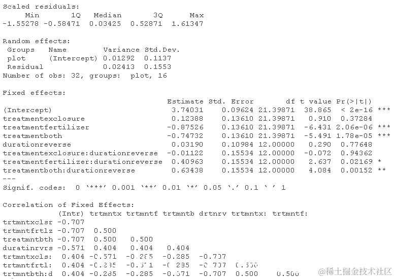 - 从保存的lmer对象中提取参数估计值(系数)。检查随机效应的输出。随机变异的两个来源是什么?固定效应指的是什么?
