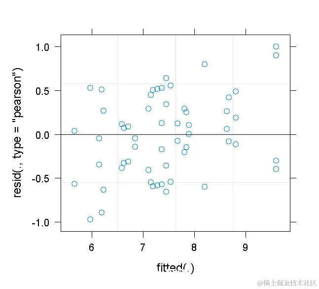 - 产生一个残差与拟合值的图。注意到有什么问题?似乎有一个轻微的正向趋势。这不是一个错误,而是最佳线性无偏预测器(BLUPs)"收缩 "的结果。